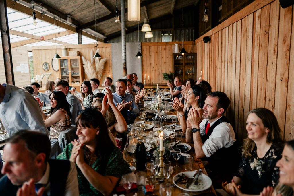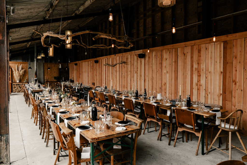 This is where everyone eats, and it’s unlike any dining room you’ve seen at a wedding. Think long communal tables, candlelight, sharing plates, it’s like a hipster medieval banquet.