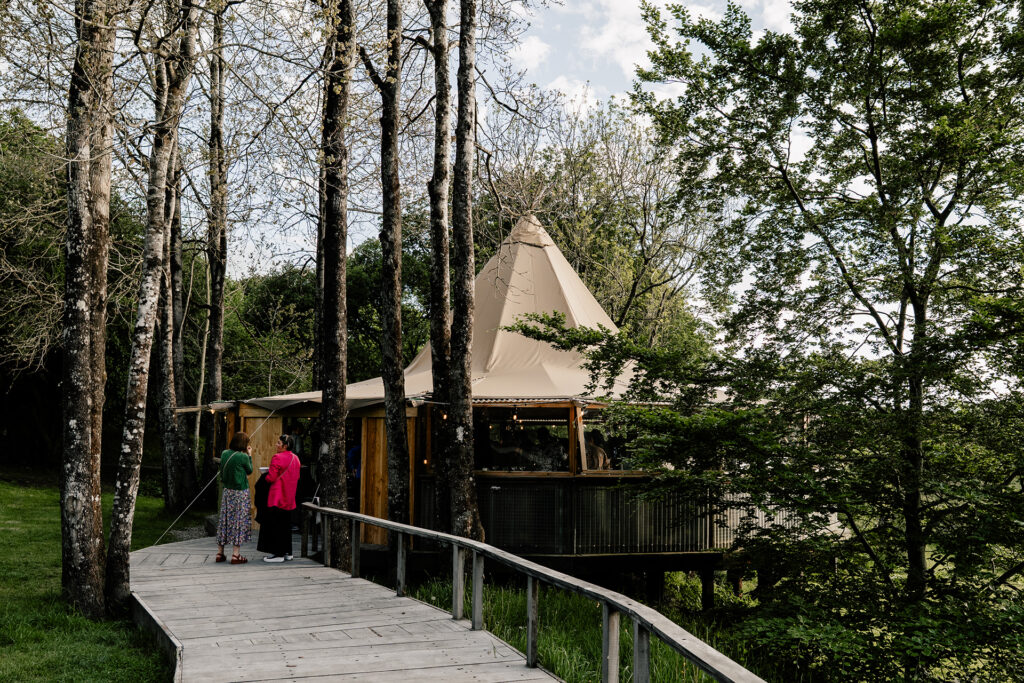 The iconic Fforest structure — a tipi with meadow views on one side and a woodland backdrop on the other. It works for ceremonies and evening celebrations alike, and it photographs beautifully in pretty much any light.