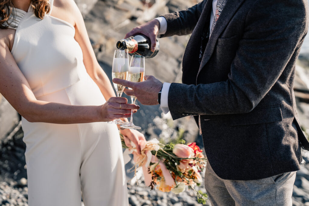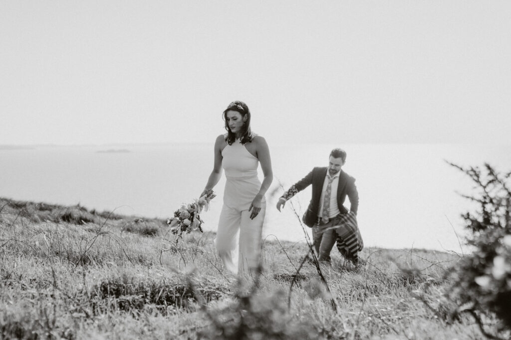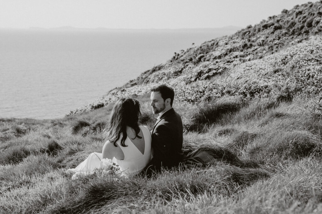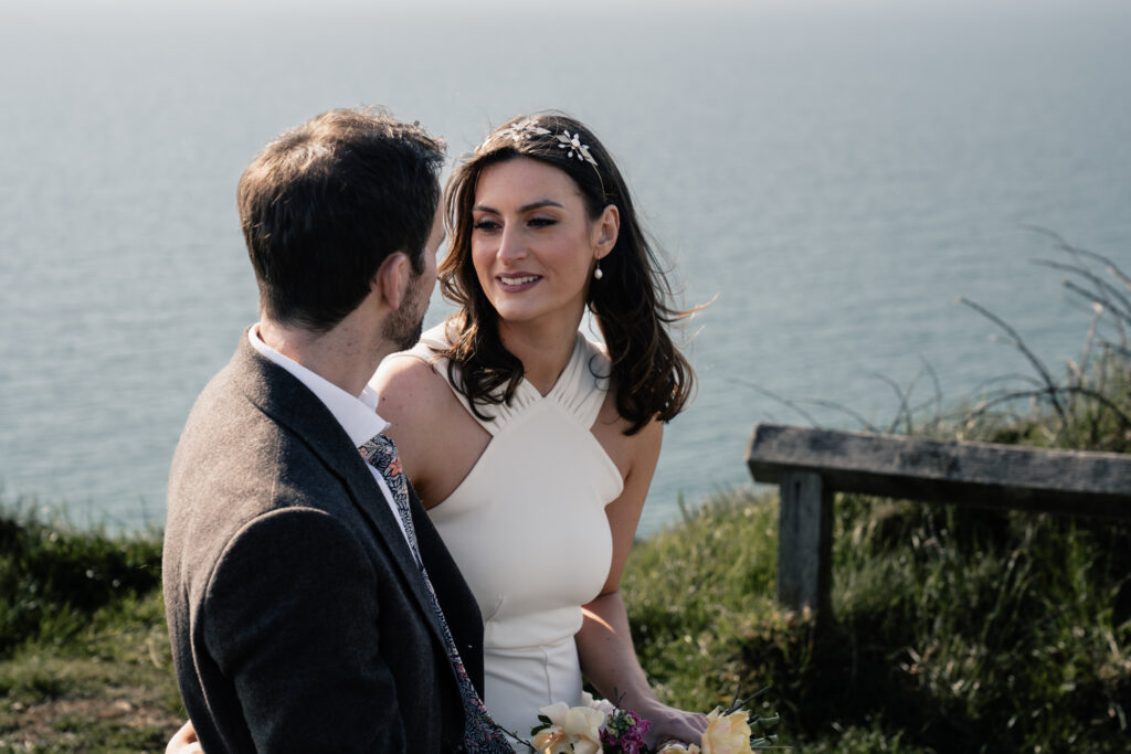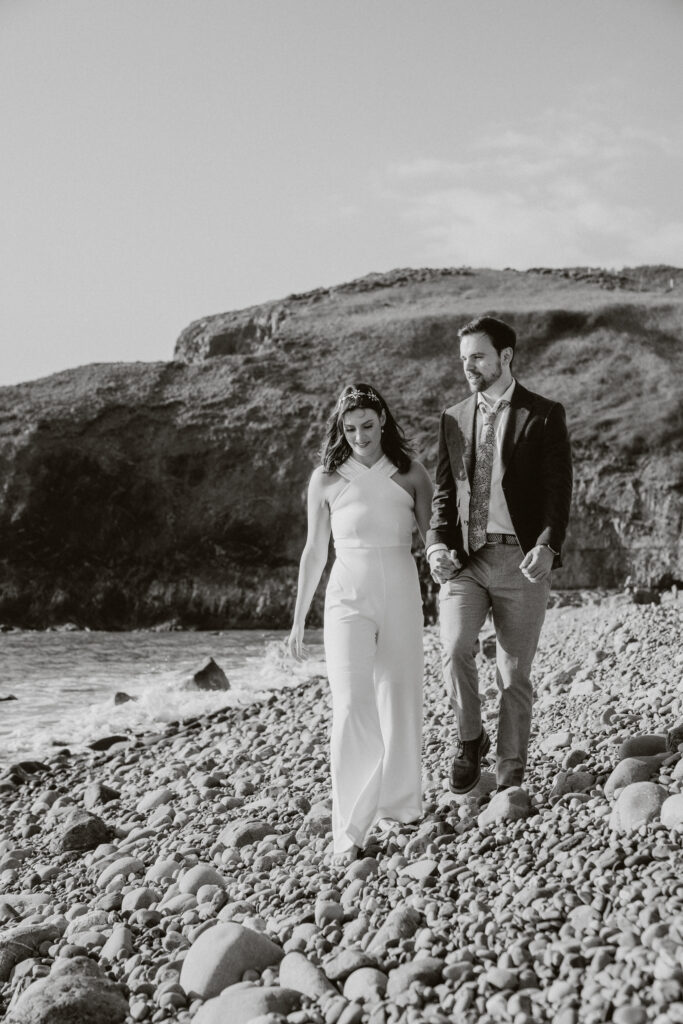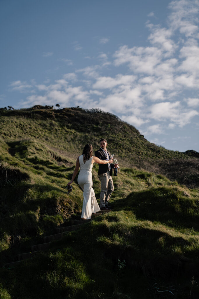 The way it opens up with its towering cliffs and rugged, untamed feel makes it unlike any other spot. It’s wild, dramatic, and perfect for those who love a bit of adventure in their elopement. No need for props or over-the-top setups just two loved up loons, the fresh sea air, and maybe a bottle of champagne to top it off.